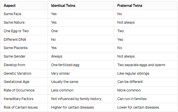 So, fraternal twins come from two separate eggs and sperms, while identical twins come from one egg and sperm that split into two. They have their own special ways of forming and looking, and it’s really interesting to learn more about them!